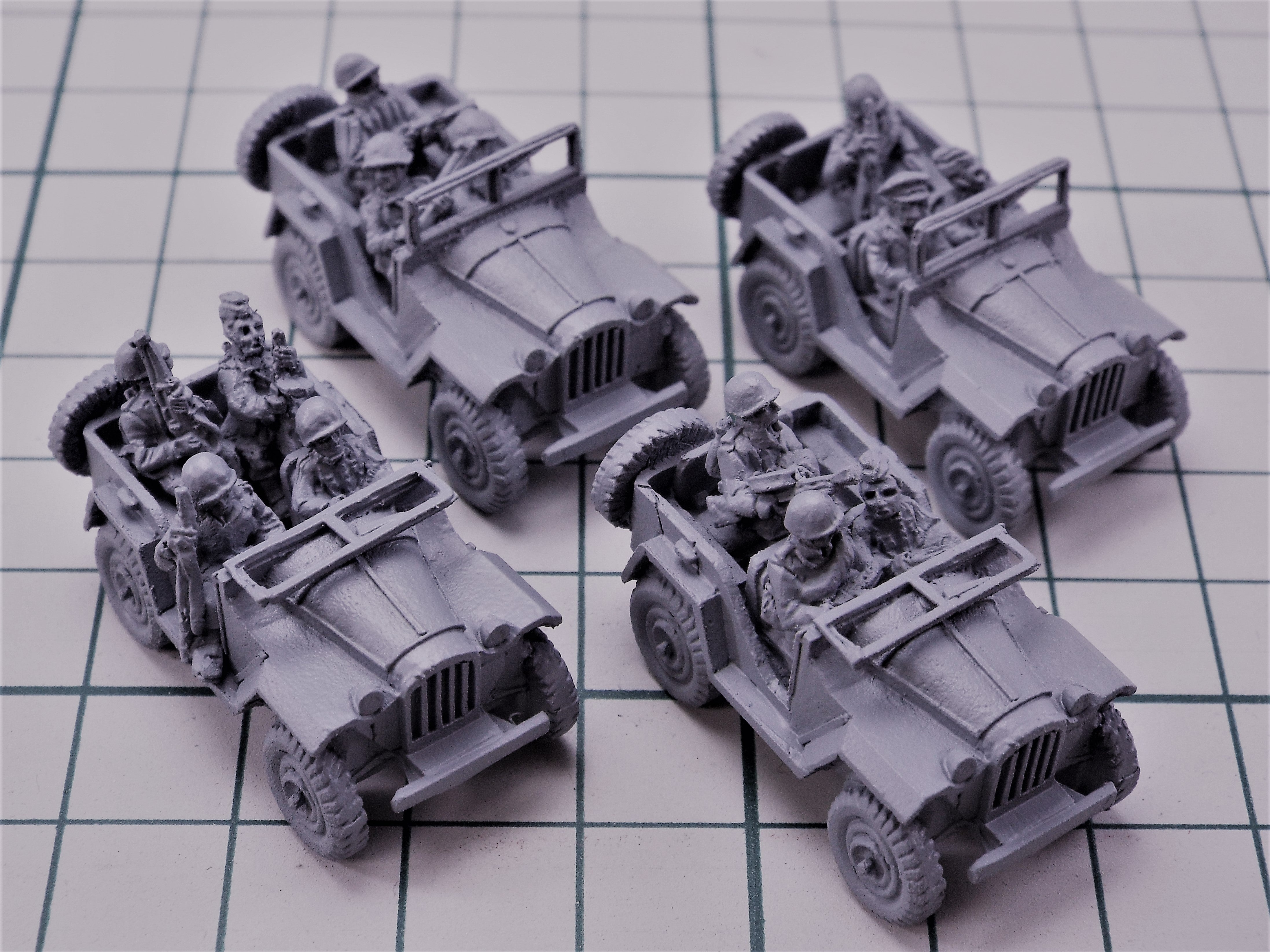 Russian Gaz 67 Jeep Pack with Crew. 4 one-piece Jeep models with separate windscreens plus 15 crew members. A selection of 6 drivers and 9 passengers including 1 officer, 1 holding a D.P LMG, 3 with PPSh SMG & 4 with rifles.