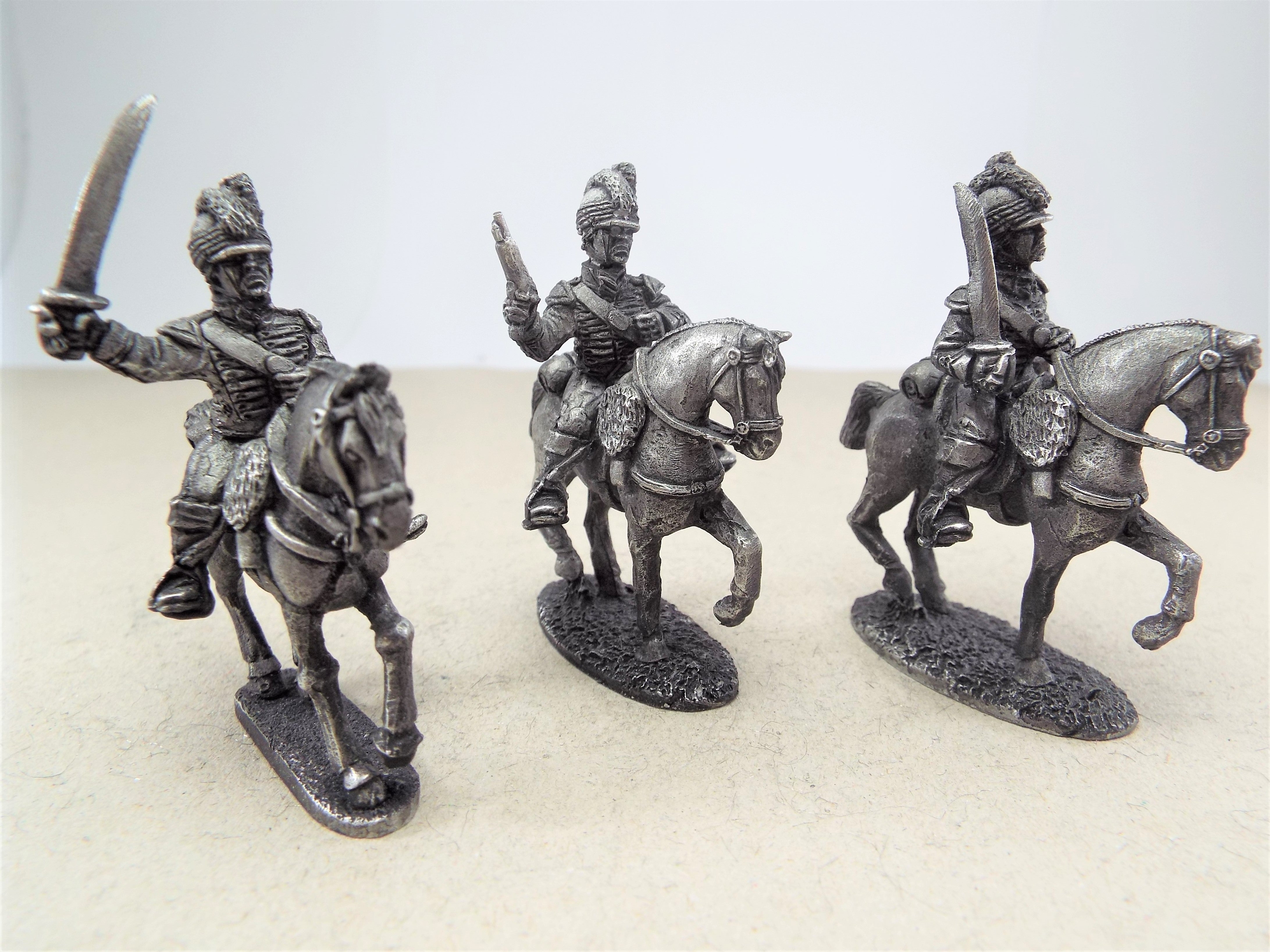Irish Mounted Yeomanry wearing a light dragoon style uniform, with Tarleton helmet. This blister pack contains three unpainted mounted figures supplied with seperate heads. Examples of the figures are shown above. Figures are supplied unpainted and unassembled.