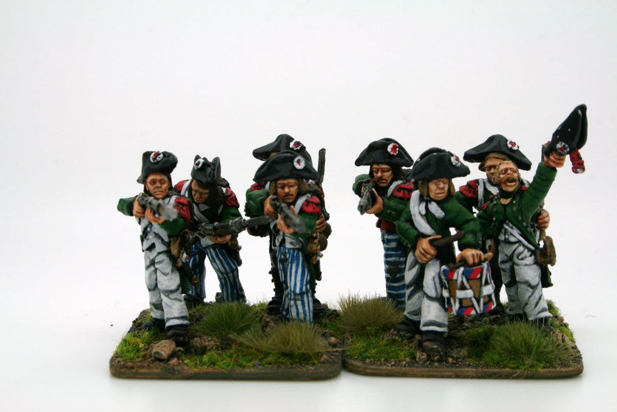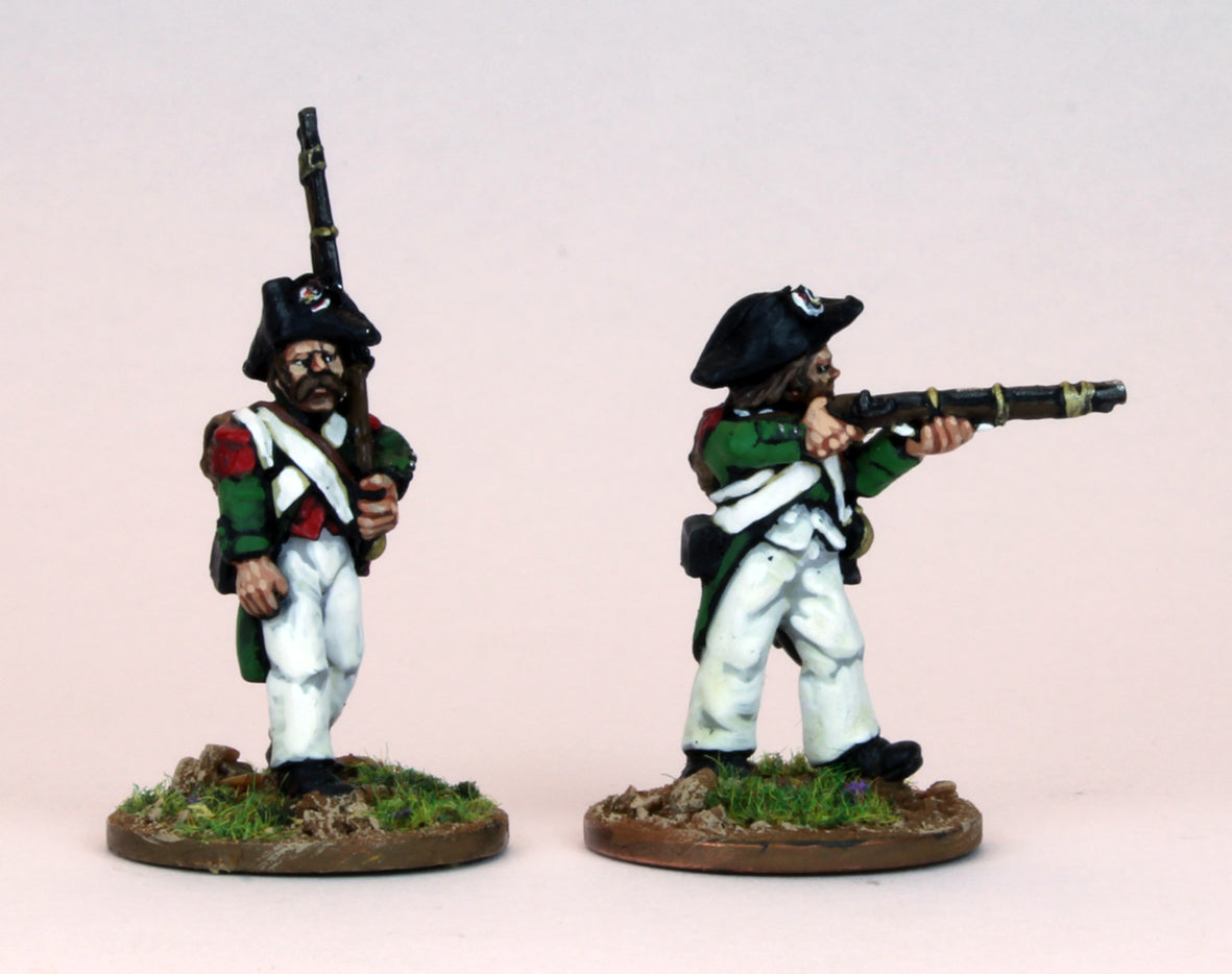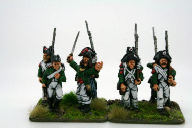 The gallery pictures show the figures used with French command figures from packs FLi05 and Fli11. The Austrian Battalion was formed by Napoleon and shipped off to St. Dominguez as part of the invasion force in 1802 sent out to the Caribbean, with a strength of 1000+. It fought well, but by Autumn had been reduced to less than 200 men. The uniform style is identical to French Ligne fusiliers, but with epaulettes. The coat colour was green, with green collar& cuffs. Epaulettes were red, waistcoat & trousers white. All the officers and half the NCo’s were French.