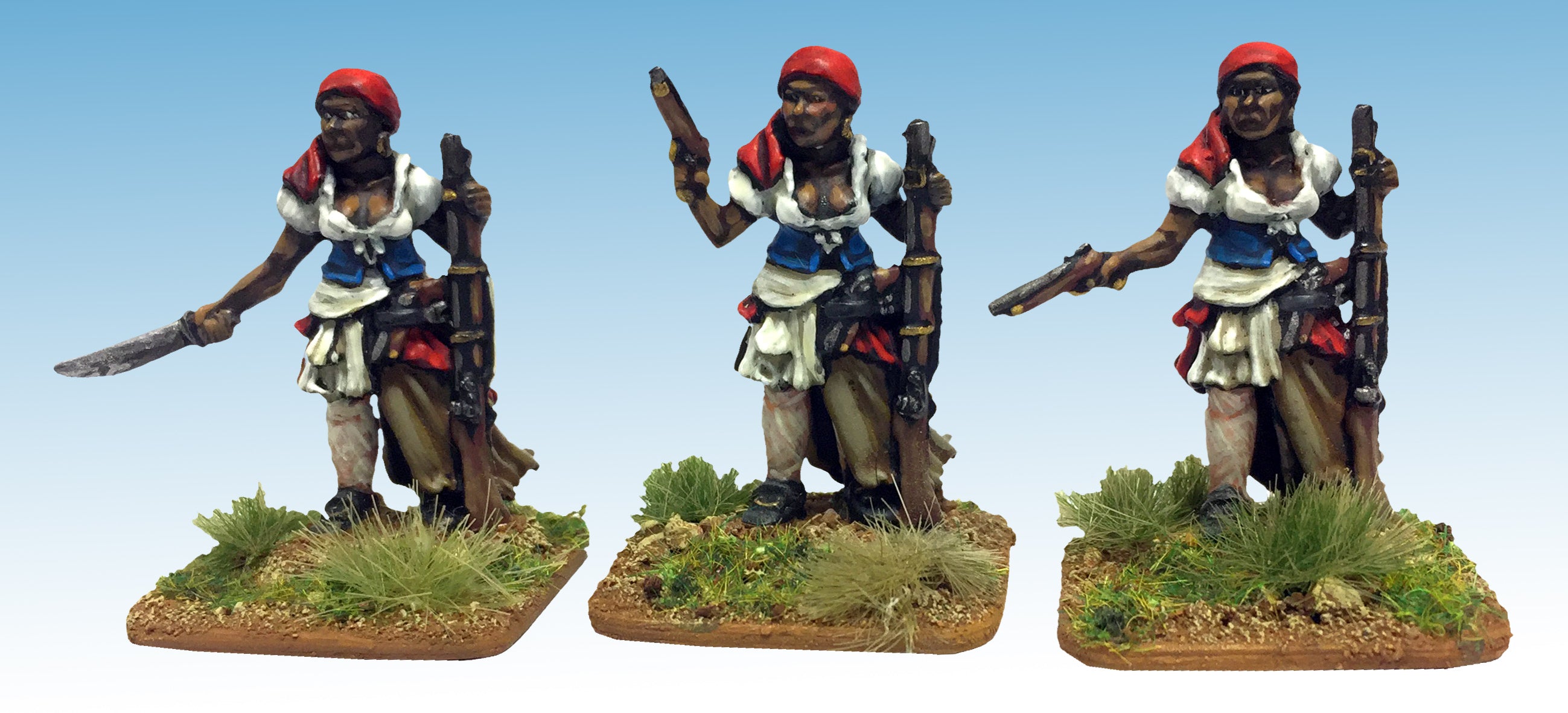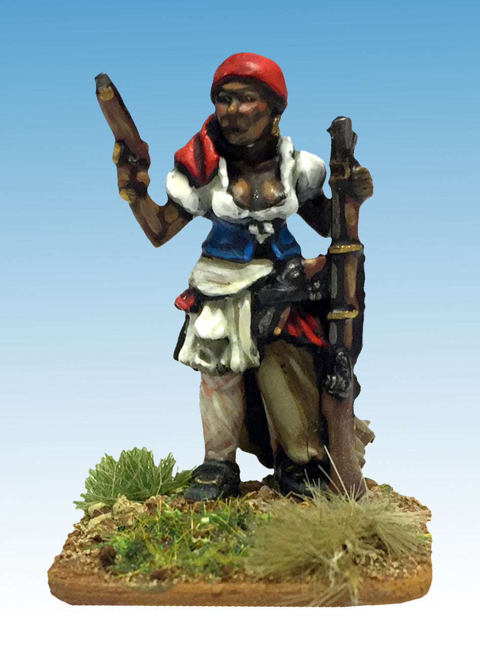 The pack contains one figure representing Marie-Jeanne Lamartiniere, a female soldier in Toussaint Louverture’s army. She fought with Dessalines in the defence of Crete-a-Pierrot against Napoleons invading French. The figure comes with a choice of three arms